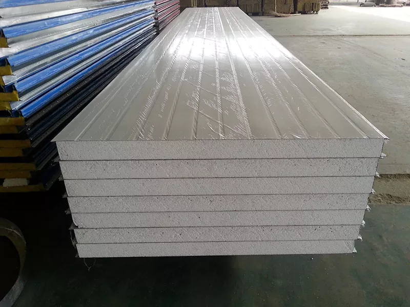 EPS အသားညှပ်ပေါင်မုန့်ပြားများကို တိကျပြီး တသမတ်တည်း အရည်အသွေးထိန်းချုပ်မှုသေချာစေရန် စက်ရုံဆက်တင်တွင် ကြိုတင်ပြင်ဆင်ထားသည်။ EPS core ကို polystyrene ပုတီးစေ့များကို ချဲ့ထွင်ပြီးနောက် သတ္တုပြားများကြားတွင် ညှပ်ဖြင့် ဖွဲ့စည်းထားသည်။ ထို့နောက် အကန့်များကို အရွယ်အစား ဖြတ်ပြီး ဆိုက်တွင် တပ်ဆင်ရန် အသင့်ဖြစ်နေပါပြီ။