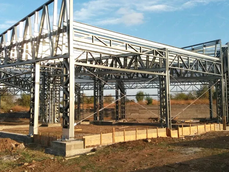 4. သံမဏိဖွဲ့စည်းတည်ဆောက်ပုံ တပ်ဆင်ခြင်း အဆင်သင့်ပြုလုပ်ထားသော သံမဏိအစိတ်အပိုင်းများကို ဆောက်လုပ်ရေးလုပ်ငန်းခွင်သို့ ပို့ဆောင်ပြီး ကရိန်းများနှင့် အခြားအကြီးစားစက်ကိရိယာများကို အသုံးပြု၍ တပ်ဆင်သည်။ တပ်ဆင်ခြင်းလုပ်ငန်းစဉ်သည် အခြေခံအုတ်မြစ်တွင် ကော်လံများကို စိုက်ထူခြင်းနှင့် ကျောက်ချခြင်းမှအစပြုကာ ဂိုဒေါင်ဘောင်ကိုဖွဲ့စည်းရန် ထုပ်တန်းများတပ်ဆင်ခြင်းဖြင့် စတင်သည်။ ထို့နောက် အမိုးအကာစနစ်ကို အထောက်အကူပြုရန်အတွက် အမိုးစည်းများကို လုံခြုံစေပါသည်။
